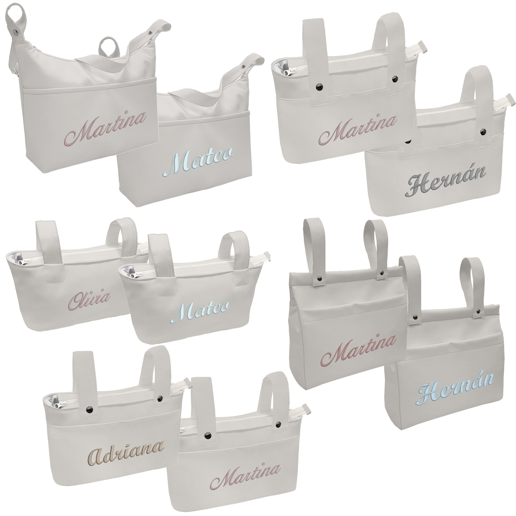 Cuenta con un bolsillo exterior en todo el lateral también en polipiel lisa. Asas para sujetar en el carrito mediante broches de presión y un asa larga en el interior para cuando quieres usar el bolso para llevar al hombro.